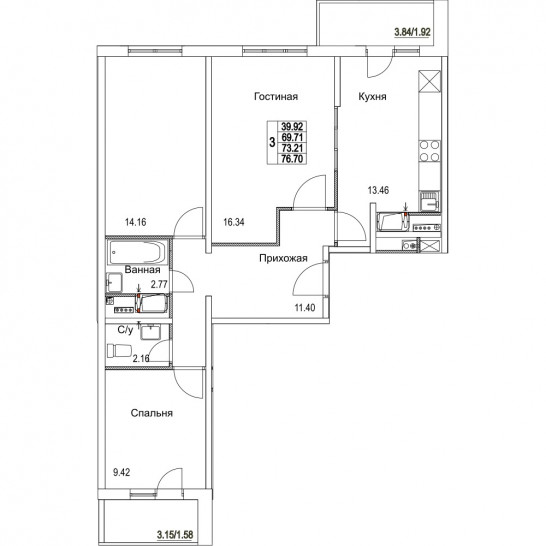 Трёхкомнатная квартира 73.21 м²