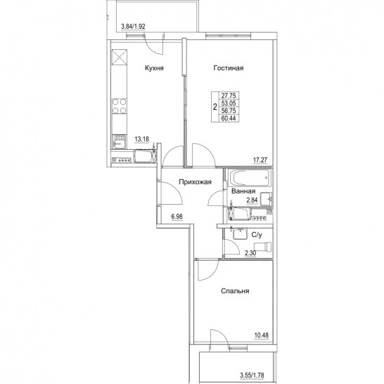 Двухкомнатная квартира 56.75 м² в ЖК «Мир Митино»