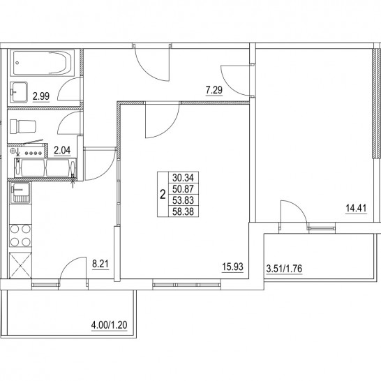 Двухкомнатная квартира 53.83 м²